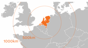 Seit Jahrhunderten genießen die Niederlande einen hervorragenden Ruf als Handelsnation. Importe und Exporte lassen sich hier reibungslos abwickeln – unterstützt durch die zentrale Lage innerhalb Europas und den hervorragenden Zugang zum europäischen Markt. Ein einfacher Maßstab für diese Konnektivität: Ein Umkreis von 500 km um die Niederlande erschließt einen Markt mit 170 Millionen Verbrauchern. Bei 1.000 km steigt diese Zahl auf 244 Millionen – das Herz der europäischen Kaufkraft.